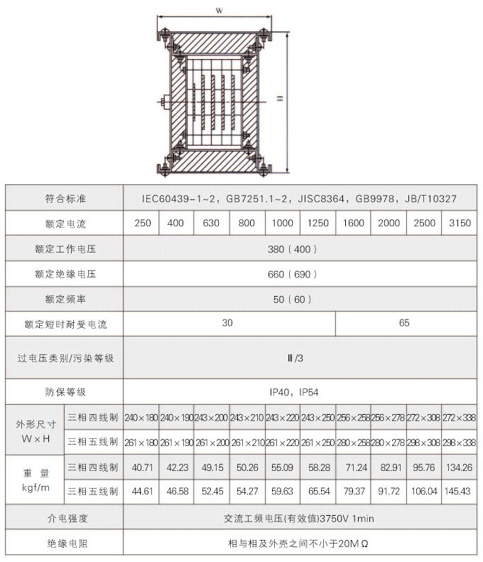 耐(防)火母线槽适用于消防要求较高的交流50-60HZ,电压660V及以下,额定电流250-3150A的三相四线制、三相五线制供配电系统。 该系列母线槽承载能力强、耐火时间长,耐火极限为30min-120min,耐火温度850摄氏度-1100摄氏度,选用性能优良的云母缠绕绝缘、耐火材料根据需要可采用硅棉、耐火涂料等,接头隔板(块)采用高温陶瓷等制成,是环保产品且布线灵活。